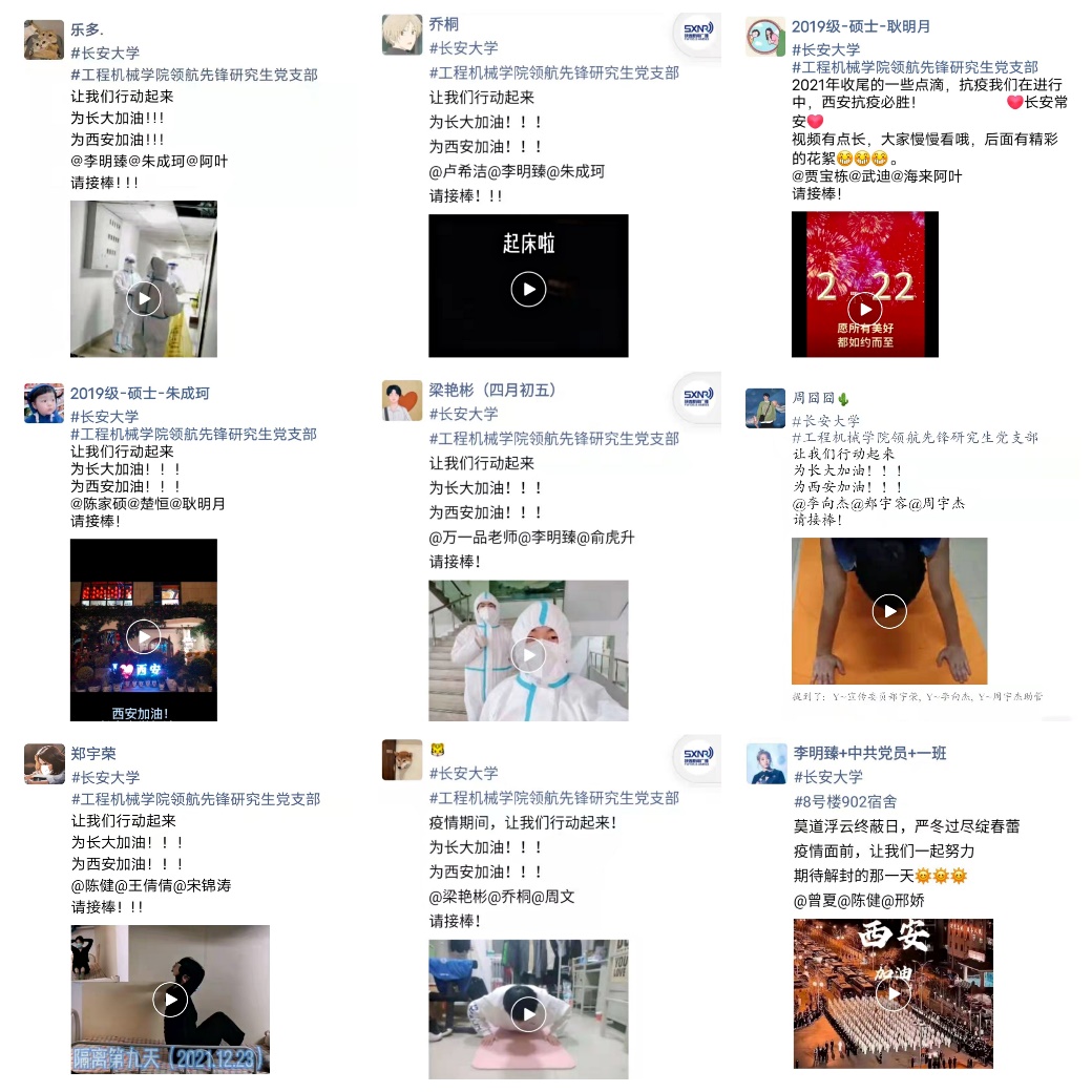 遇到困难勇于担当,是我们党的红色基因和精神追求。在疫情防控期间,党支部部分成员隔离在宿舍中,无法加入志愿者队伍,但他们通过开展“为长大加油,为西安加油”的线上主题活动,以拍视频的方式将自己隔离期间科研学习、锻炼身体等日常记录下来并发布在社交媒体上,鼓舞大家战胜疫情的决心,坚定大家战胜疫情的信心,为这场战斗贡献一份热,发一份光。