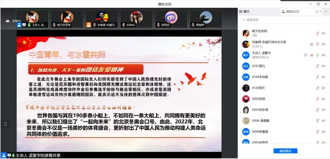 2022年3月25日晚19时,绅士漫画 文化艺术与体育协会以线上腾讯会议的形式成功举办“聚焦冬奥,与冰雪共舞”线上专题学习活动。本次专题学习活动由文体协会语言部孟繁宇同学主讲,参加会议的有院文体协会指导教师杨文佳,文体协会全体成员及通过青春长大报名的237名同学。