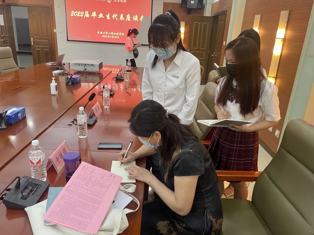 最后,于丽娟书记寄语即将离别的毕业生,提出了三点希望。首先,牢固树立理想信念,立志报国。将小我融入大我,用青春奉献祖国,肩负起中华民族伟大复兴的历史使命。其次,积极担当进取,拼搏奋进。时刻铭记“弘毅明德,笃学创新”的校训精神,勇敢地面对困难与挫折,以拼搏的姿态踏上新的征程。最后,关注学校发展,爱校荣校。聚是一团火,散是满天星,祝愿大家在各行各业发光发热,成为优秀校友,也欢迎大家多回母校看看。会后,同学们纷纷请于丽娟书记在毕业纪念册上写下赠言。