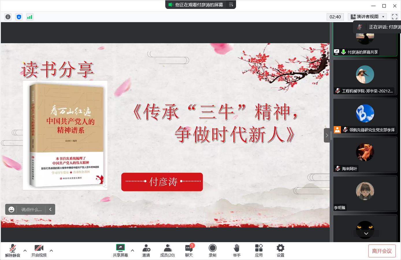 付彦涛:孺子牛、拓荒牛、老黄牛,是我们党人民至上、开拓创新、艰苦奋斗等光荣传统的生动表达。“三牛”精神与中国共产党人精神谱系中的各种精神一脉相承,具有“穿透时空的持久力量”。奋斗新时代,阔步新征程,作为领航先锋研究生党支部的一名成员,我们要传承发扬“三牛”精神,辛勤耕耘,一往无前!