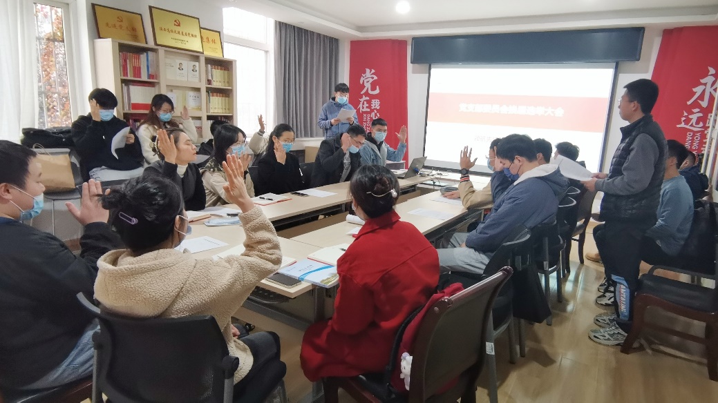 首先,李泽宣读党组织委员会选举办法,确定了监票人、计票人等相关工作人员。随后李泽宣读了候选人名单并汇报候选人情况,宣读投票方法后开展换届选举工作。经支部大会充分讨论、发表意见并由正式党员无记名、差额投票表决,选举产生新一届支部委员会成员为王晨光、周文、郑宇荣、高婷婷。随后新一届支委成员召开第一次支委会,经支委会讨论,确定新一届支委会分工:领航先锋研究生党支部书记为高婷婷、副书记为周文、组织委员为王晨光、宣传委员为郑宇荣。