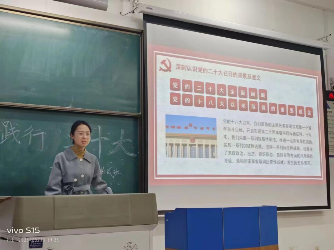首先,班长黄磊带领大家回顾了党的二十大报告的主要内容,并对党的二十大精神做出系统化的总结,使同学们深刻领悟到党的二十大精神,以及党的百年奋斗路程和取得的一系列成果。会上,班长通过两段短视频向同学们展示了平凡人也可以为祖国的繁荣昌盛贡献力量,发人深思。