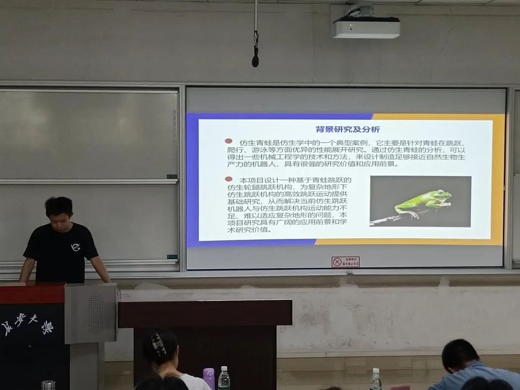 答辩时间限定为每组5分钟,距离答辩结束一分钟将由工作人员提醒。随后由评委老师对项目提出提问并进行指导。本次比赛有基于青蛙跳跃的仿生轮腿跳跃机构、蜘蛛爬行仿生机器人、磁吸附式六足仿生爬壁机器人等共计33组项目。