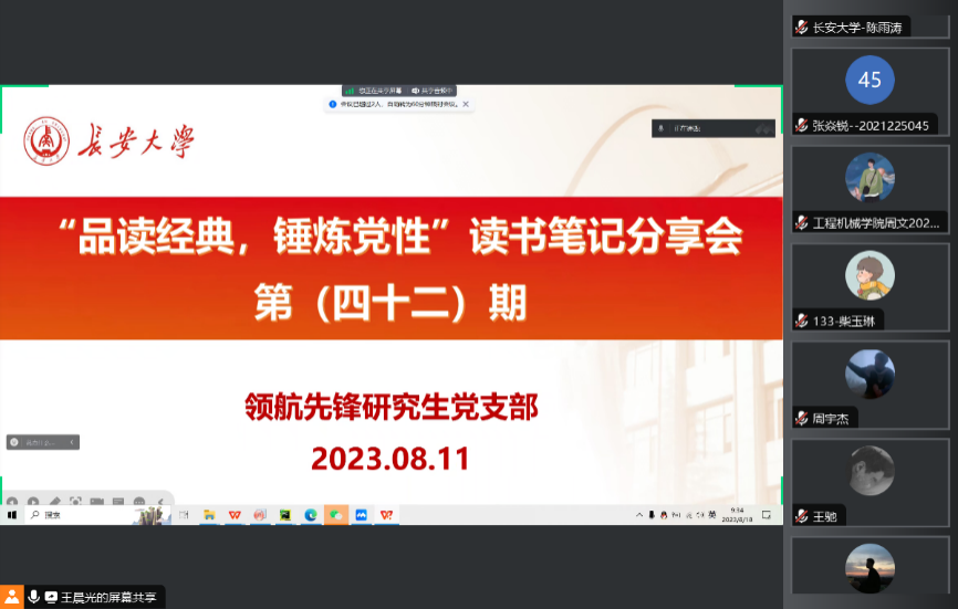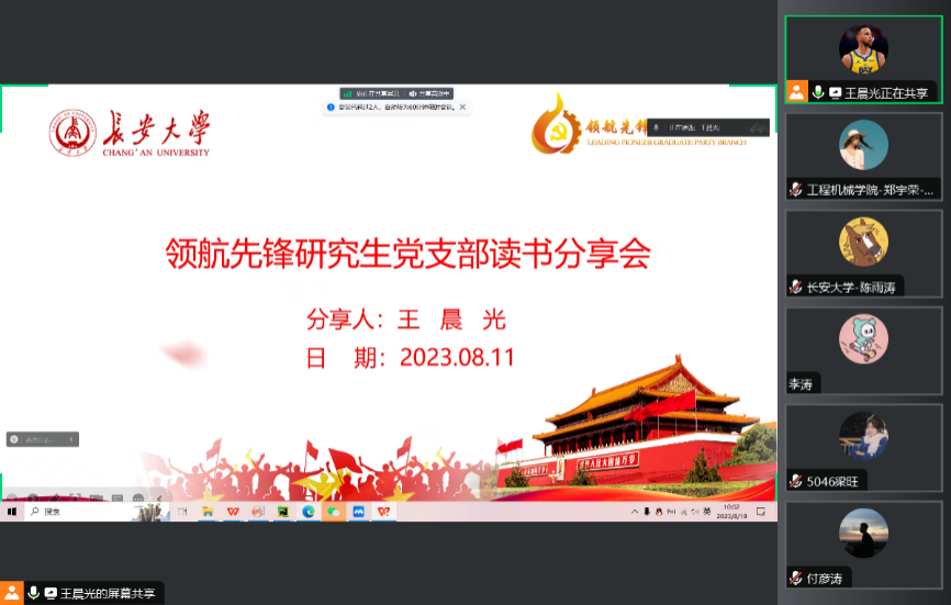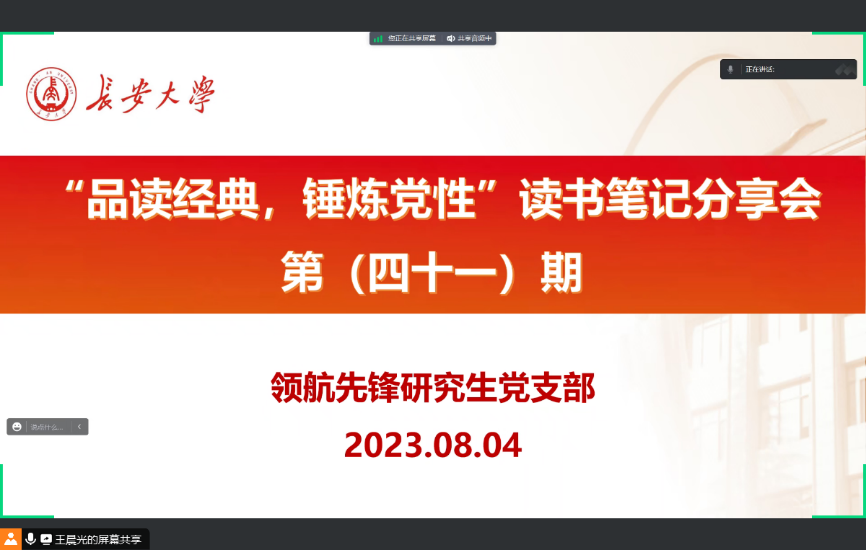 2023年8月11日,绅士漫画 领航先锋研究生党支部组织支部成员线上开展了第四十二期“品读经典,锤炼党性”读书分享活动,本次读书分享活动对照支部主题教育学习安排,由支部成员王晨光、柴玉琳领学。