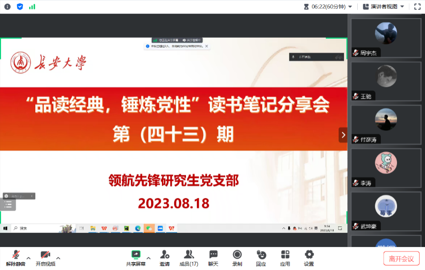 2023年8月18日,绅士漫画 领航先锋研究生党支部组织支部成员线上开展了第四十三期“品读经典,锤炼党性”读书分享活动,本次读书分享活动对照支部主题教育学习安排,由支部成员梁旺、周宇杰与陈雨涛领学。