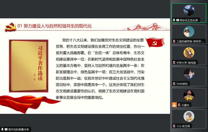周宇杰表示:作为一名研究生党员,我对习近平总书记提出的建设人与自然和谐共生的现代化主题深有感触。我认为这是一种符合中国特色、符合人类命运共同体的现代化理念,既体现了中华民族对自然的尊重和热爱,又展现了中国对全球生态文明建设的担当和贡献。建设人与自然和谐共生的现代化是一项艰巨而光荣的任务,需要我们每个人都行动起来,从身边的小事做起,从现在做起。让我们共同为建设美丽中国、推进人类文明进步而奋斗!
