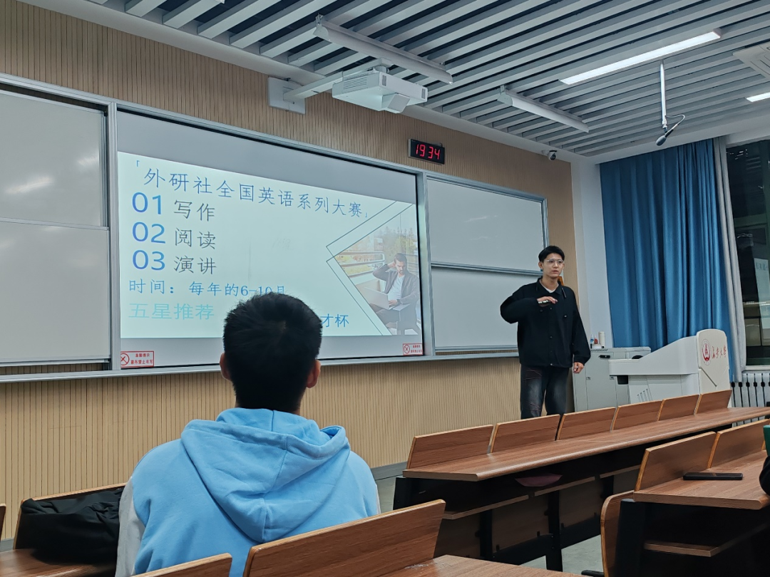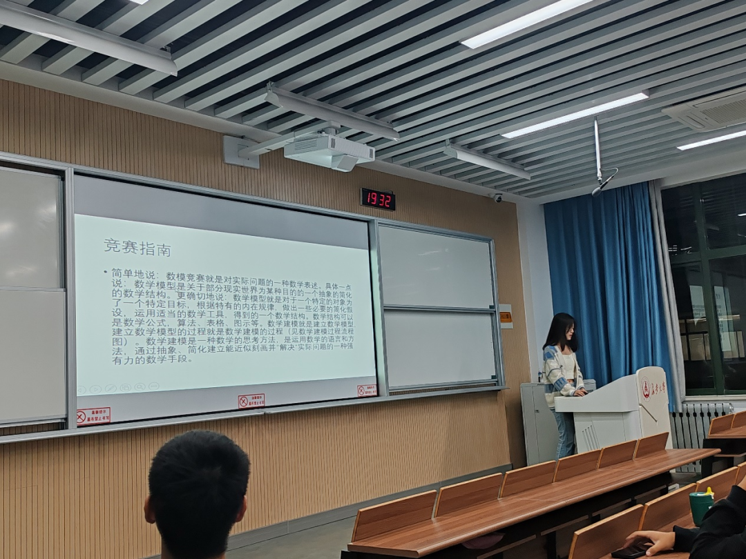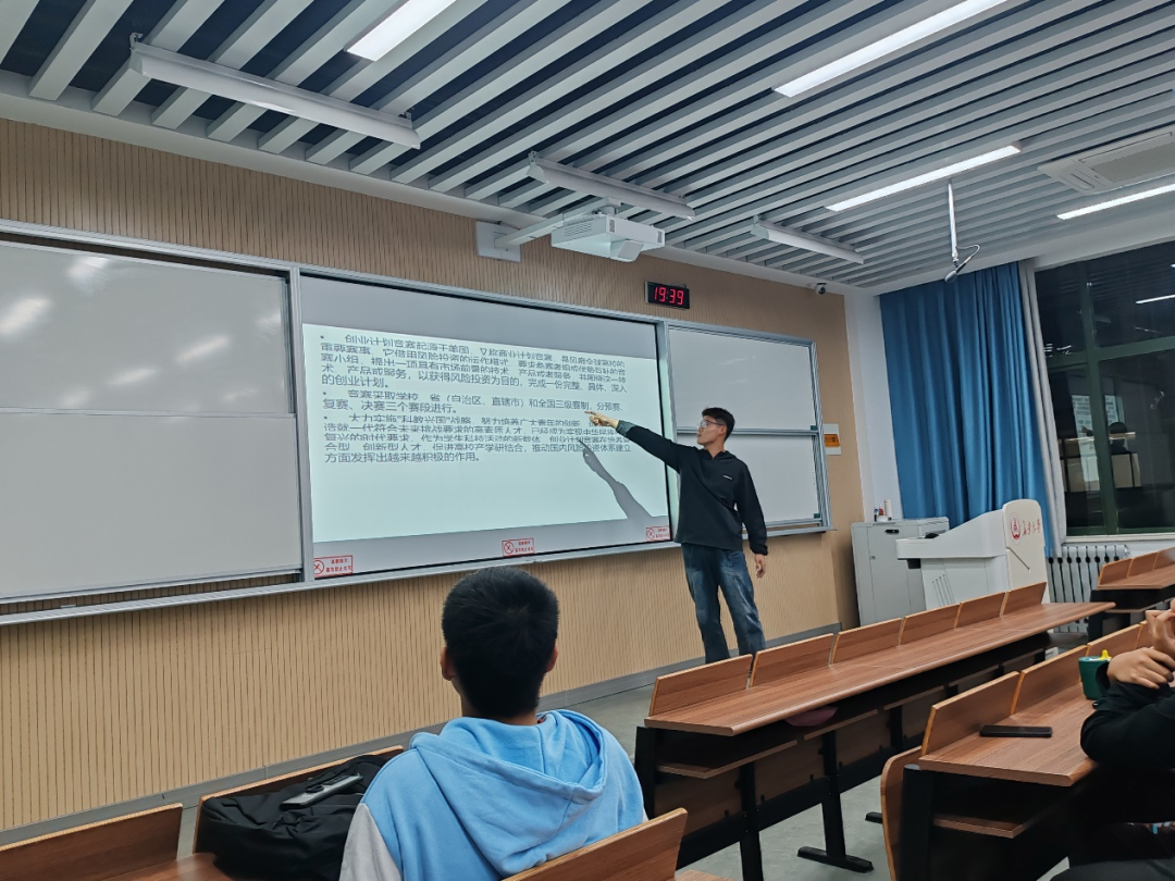 接下来由各位班委对学科竞赛进行介绍与讲解,团支书杜睿莹讲解了全国大学生数学建模竞赛、学习委员窦永毅讲解了外研社杯和全国大学生英语竞赛、生活及心理委员李若彤讲解了挑战杯系列赛、体育委员冯燚讲解了全国大学生创新创业训练计划、班长贠浩华讲解了全国大学生机械创新设计大赛和全国大学生机器人比赛。