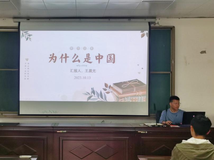 在读书分享环节,王晨光领学了《为什么是中国》一书。《为什么是中国》由中国人民解放军少将金一南撰写,是作者本人30年创作生涯的集大成之作。从百年沧桑到民族复兴,作者在字里行间解读中国道路、书写中国力量、彰显中国自信,回答了“为什么是中国”这一历史之问。在“觉醒之路”中,作者通过“散沙”“变局”“星火”“重生”“醒狮”五个章节,以历史为脉络,分析了近现代初期破碎山河中的世道人心、歧路惶恐间的挣扎徘徊,解读阐释了共产党人的伟大历史自觉和抗战胜利的能量密码;在“发展与博弈”中,作者又通过“利益”“制胜”“大势”三个章节,鸟瞰钩沉中国崛起征途中的较量,理性瞻望改革强军的挑战机遇和世界格局的未来走向。