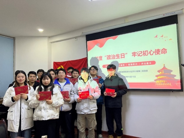 结束集中学习后,赵倩代表硕士生2022级第二党支部委员会向13位党员赠送“政治生日”贺卡,并带领全体党员重温入党誓词,教育党员要时刻牢记初心使命,自觉遵守党的章程,把入党誓词作为自己的终身追求,充分发挥共产党员的先锋模范作用。
