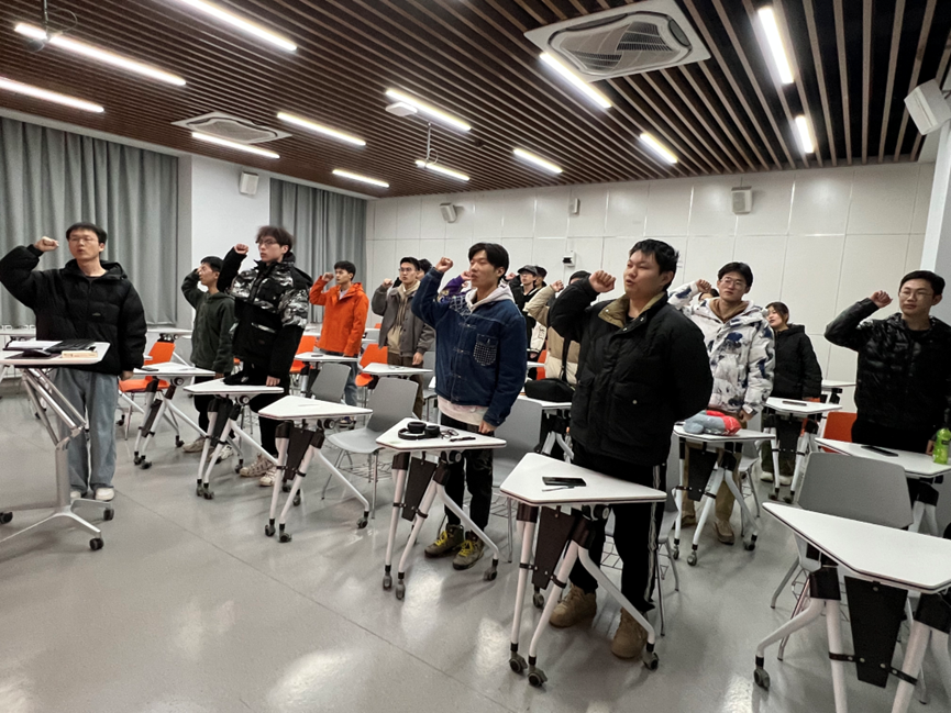 学习结束后,在米雨森同学的带领下,全体团员起立,举起右拳,进行了重温入团誓词宣誓活动,现场的每一位团员再次感受到了作为一名共青团员的责任与荣耀。