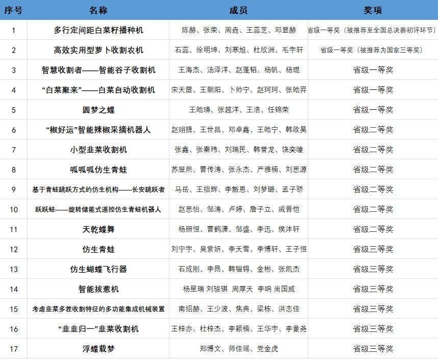 本届大赛主题为“机械创新推进农业现代化 自然和谐迈向仿生新高度”,内容为设计与制作用于生产国产杂粮和10种蔬菜的播种、管理和收获的小型专用机械、以提高仿生机械运动性能为目标的仿生青蛙和仿生蝴蝶。绅士漫画 共派出18支代表队参赛,兴农机械和仿生机械作品各9项。经过激烈角逐,参赛队伍获一等奖5项、二等奖6项、三等奖6项,其中一等奖作品“多行间距白菜籽播种机”被推荐至全国总决赛初评环节,省级一等奖作品“高效实用型萝卜收割农机”被推荐国家三等奖。