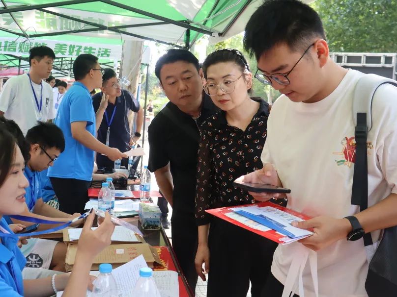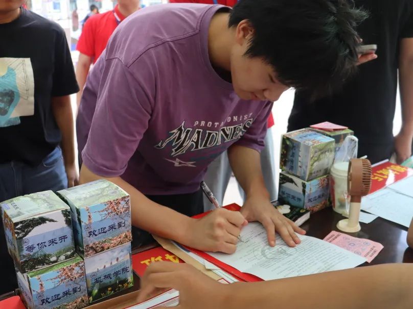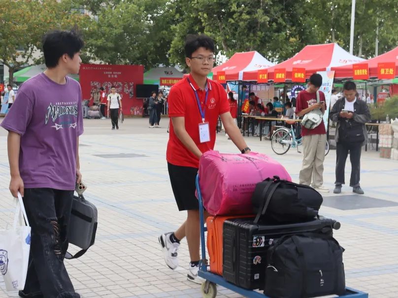 新同学们在迎新志愿者的指引下,在帐篷点依次进行学籍注册登记报到、领取礼品,等候在帐篷点外的志愿者们热情地帮助新同学们搬运行李、介绍学校,新生们也向志愿者表达衷心的感谢。