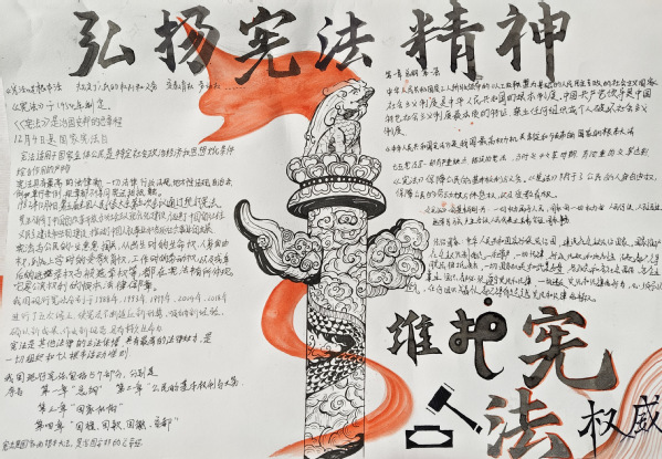 党建引领方面,学院党委高度重视宪法宣传教育工作,各学生党支部通过组织专题学习会、研讨会等形式,深入学习党关于全面依法治国的重要论述,将宪法教育融入党员日常教育管理,推动宪法精神在党员队伍中落地生根;班团建设方面,各班级、团支部积极响应学院号召,开展“学宪法 讲宪法”主题班会、“弘扬宪法精神 维护宪法权威”绘画接力等活动,通过主题班会、团日活动、知识竞答等形式,广泛宣传宪法知识,引导同学树立法治意识;法治实践方面,学院积极组织学生参与“宪法卫士”活动,网络学习率达100%,同时通过案例学习、海报制作等系列活动,增强学生法治观念和实践能力,推进宪法教育“入脑入心”。