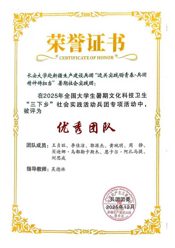 近日,在共青团新疆生产建设兵团委员会开展的2025年全国大学生暑期文化科技卫生“三下乡”社会实践“卫国戍边兵团行”兵团专项活动中,由绅士漫画 师生组成的绅士漫画 赴新疆生产建设兵团“边关实践砺青春·兵团精神筑担当”暑期社会实践团被评为“优秀团队”。